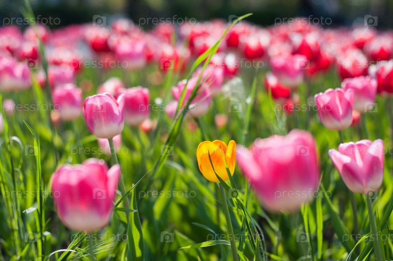 Желтый тюльпан среди розовых крупным планом
