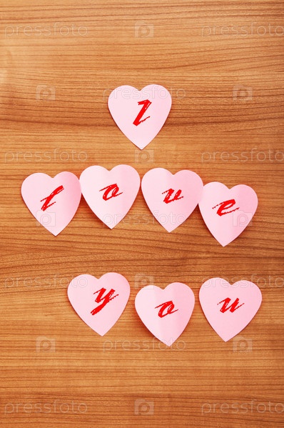 Стикеры в форме сердца со фразой 'Я люблю тебя' приклеены к столу