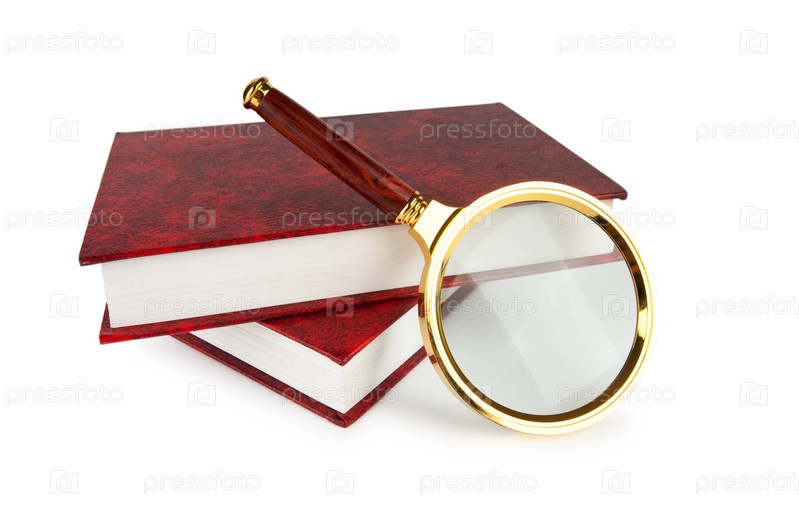 Лупа и книги на белом фоне