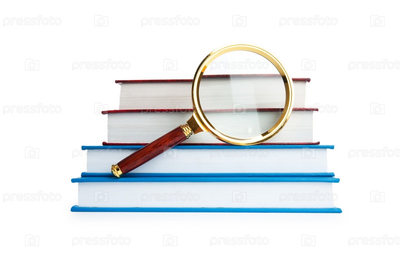 Стопка книг и увеличительное стекло на белом фоне
