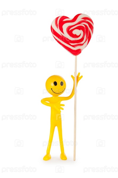 Желтый смайлик с леденцом в виде сердца на белом фоне