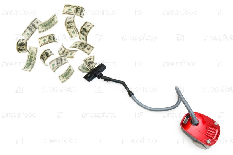 Красный пылесос всасывает доллары на белом фоне