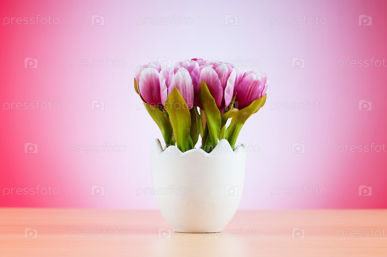 Розовые тюльпаны в горшке на розовом фоне