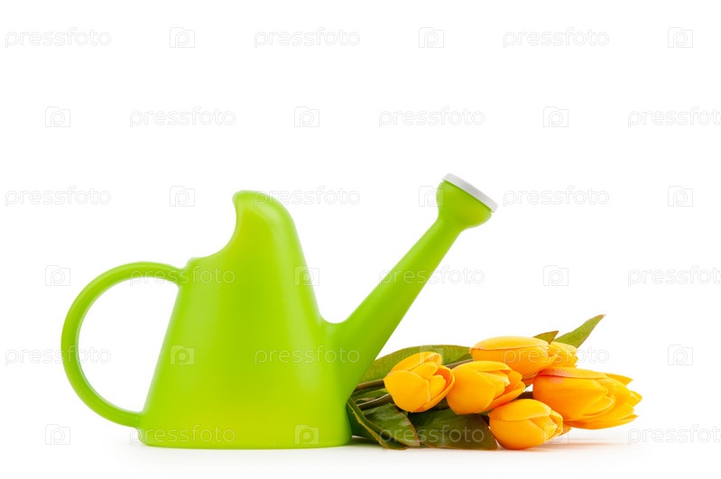 Лейка с желтыми тюльпанами на белом фоне