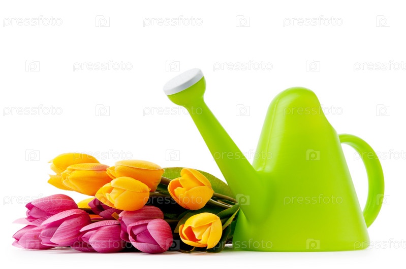 Тюльпаны и лейка на белом фоне