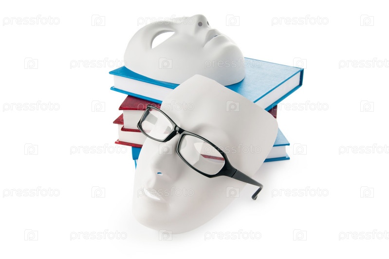 Стопка книг и маски на белом фоне