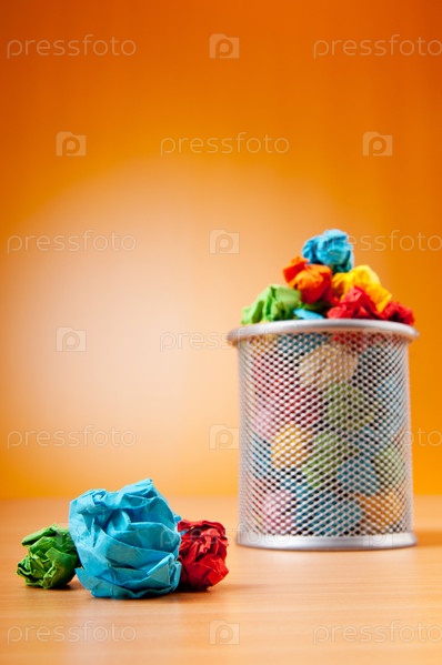 Полная корзина бумажного мусора на оранжевом фоне