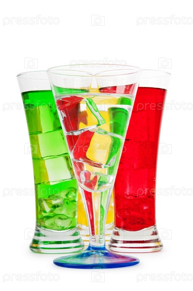 Разноцветные коктейли в бокалах на белом фоне