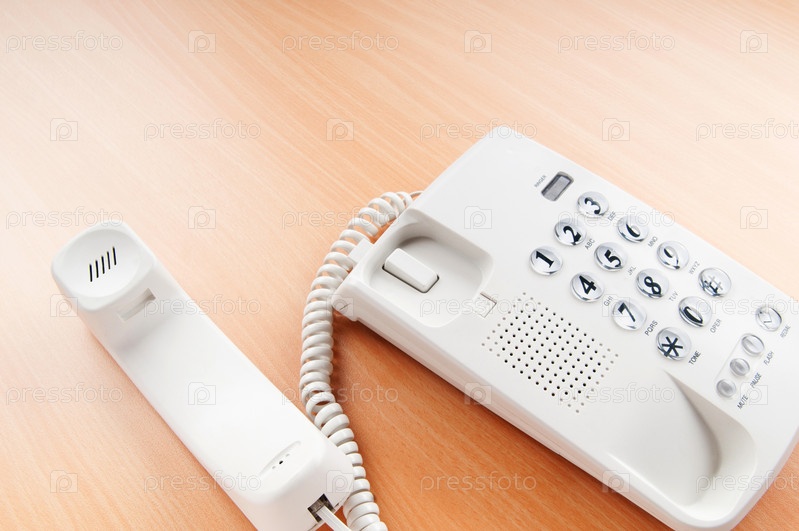 Белый рабочий телефон на столе крупным планом