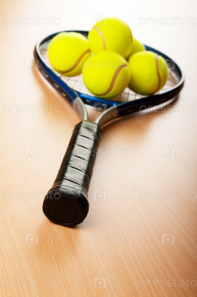 Теннисная ракетка с мячами на деревянном полу крупным планом