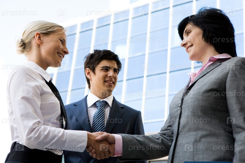 Фото успешных деловых женщин, обнимающихся после заключения сделки, в то время как счастливый мужчина смотрит на них