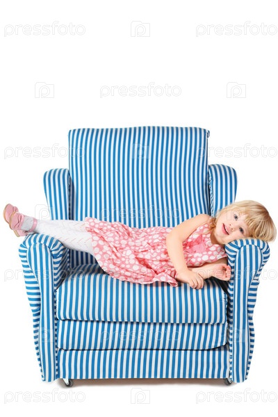 Маленькая девочка отдыхает в мягком кресле на белом фоне