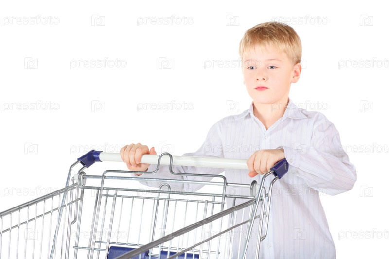 Портрет грустного мальчика с торговой тележкой на белом фоне