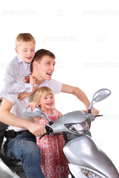 Папа катает детей на скутере на белом фоне