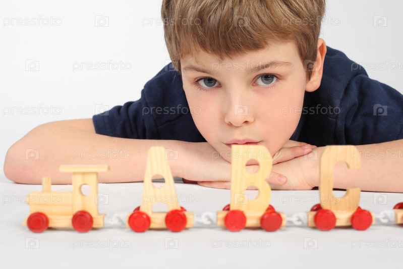 Мальчик лежит на полу и играет с деревянным паровозиком в виде английских букв