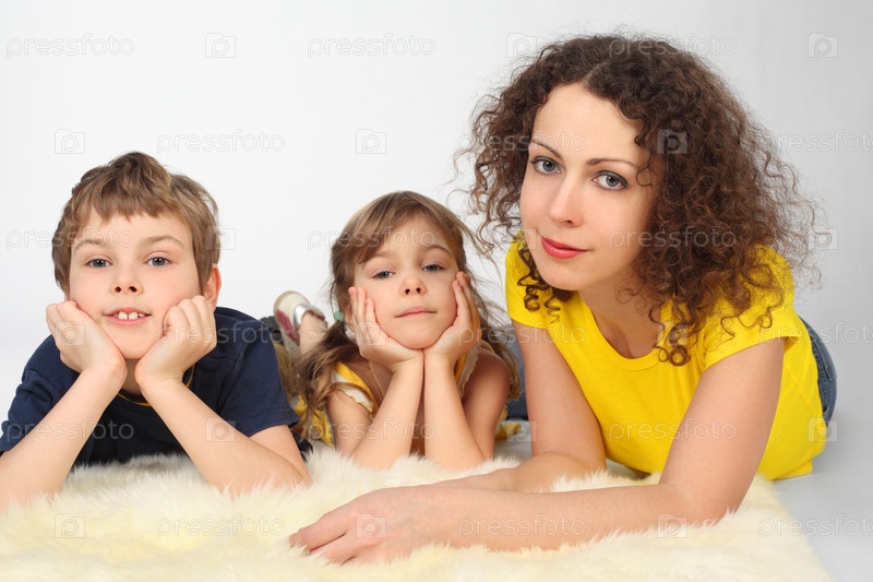 Портрет мамы с детьми на мягком ковре на белом фоне