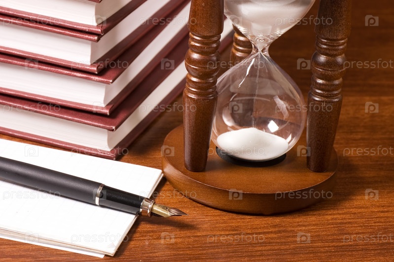Песочные часы и книги на деревянном столе