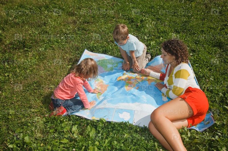 Мама с детьми на природе рассматривают карту мира