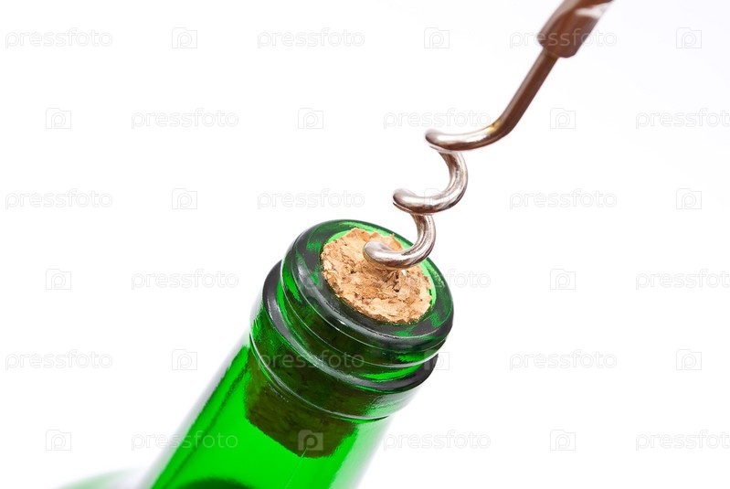 Горлышко винной бутылки и штопор на белом фоне