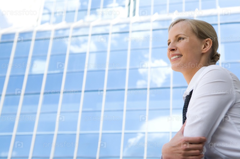 Изображение красивой бизнес-жены, которая смотрит в будущее на фоне современного здания на открытом воздухе