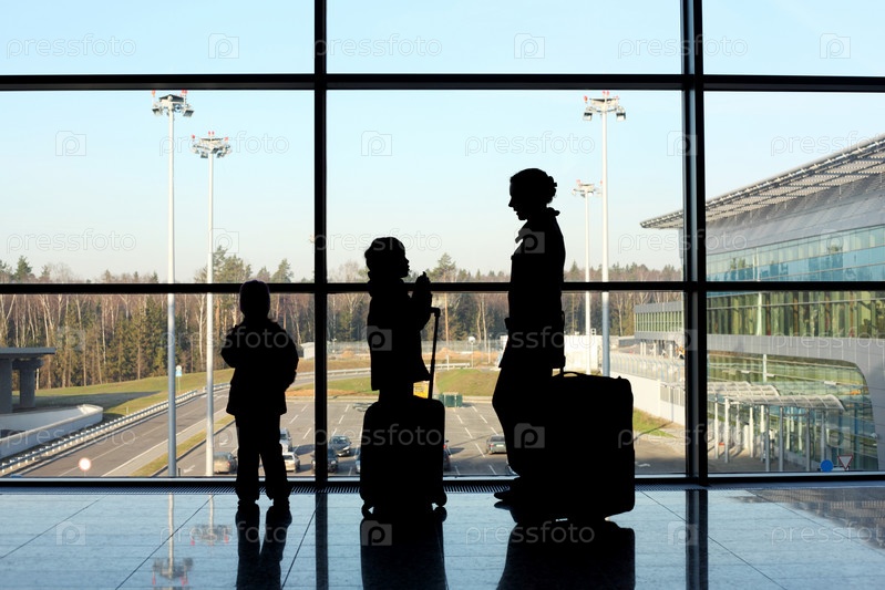 Силуэты мамы с детьми в здании аэропорта