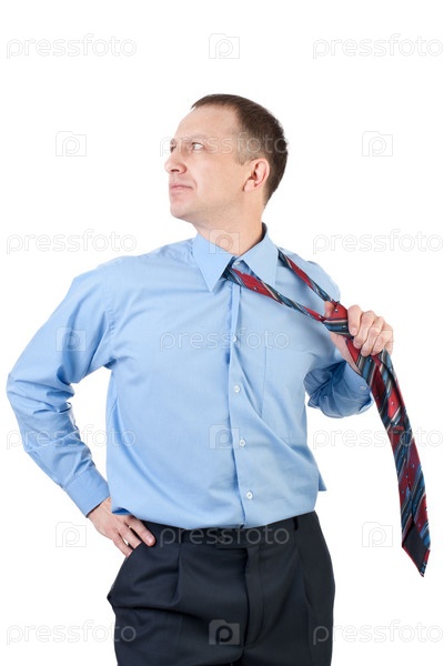 Портрет бизнесмена, поправляющего галстук на белом фоне