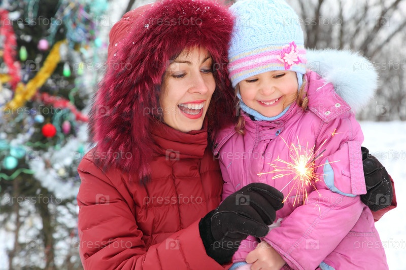 Мама и дочка с бенгальским огнем на зимней улице