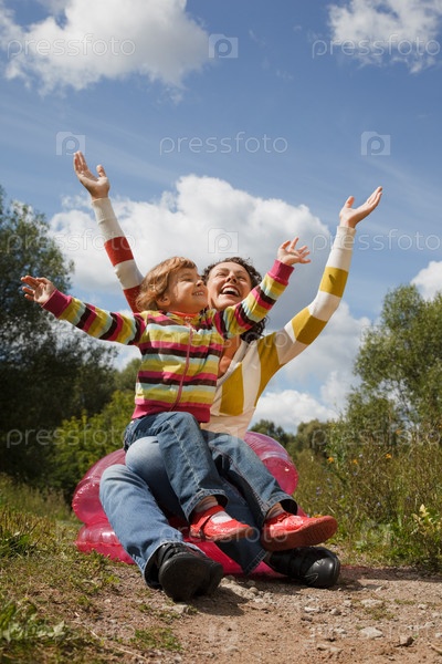 Мама с дочерью сидят на надувном кресле на природе