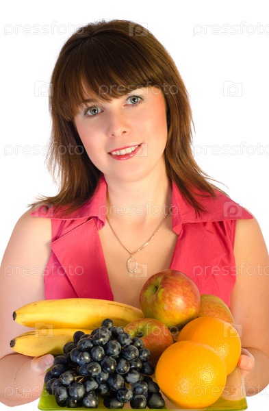 Красивая улыбающаяся девушка с блюдом фруктов, изолированным на белом