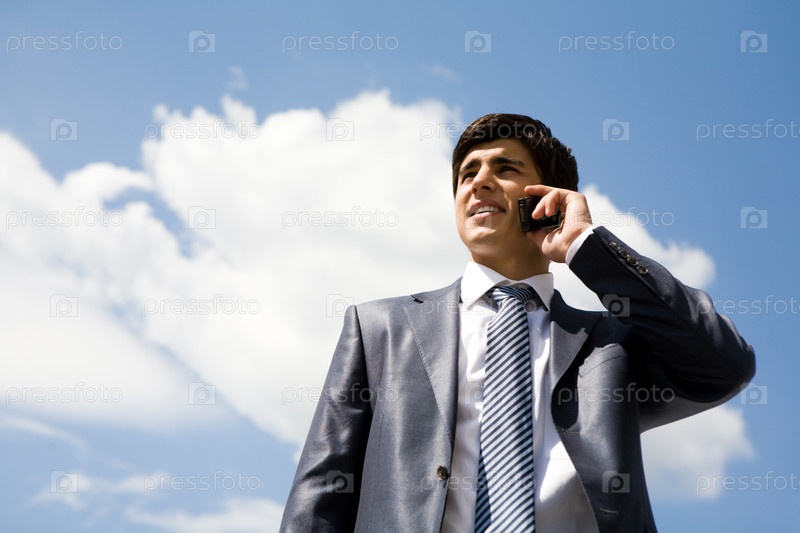 Портрет уверенного бизнесмена, звонящего по сотовому телефону на облачном небе