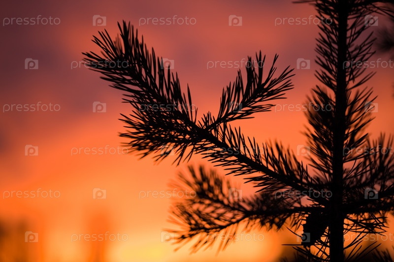 Силуэт ели на фоне закатного неба