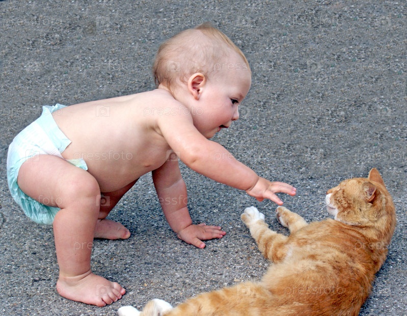 Малыш, играющий с кошкой