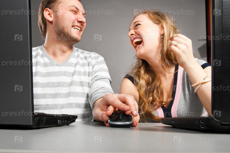 Смеющиеся мужчина и женщина держатся за одну мышку