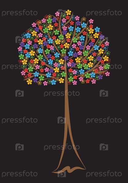 Векторное дерево с разноцветными цветами на черном фоне