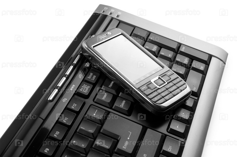 Концепция деловой коммуникации: клавиатура мобильного телефона и компьютера на белом фоне