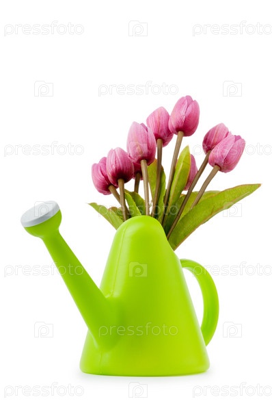 Букет розовых тюльпанов в лейке на белом фоне