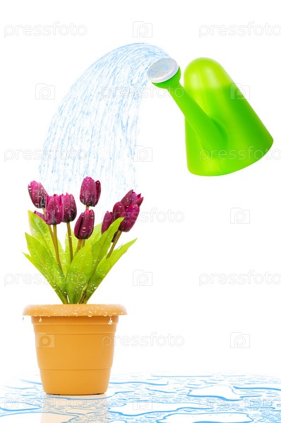Вода из лейки льется на букет тюльпанов на белом фоне