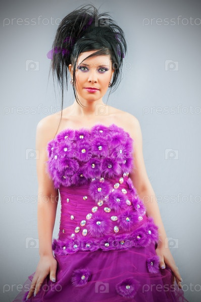 Портрет молодой невесты в ярком платье на сером фоне