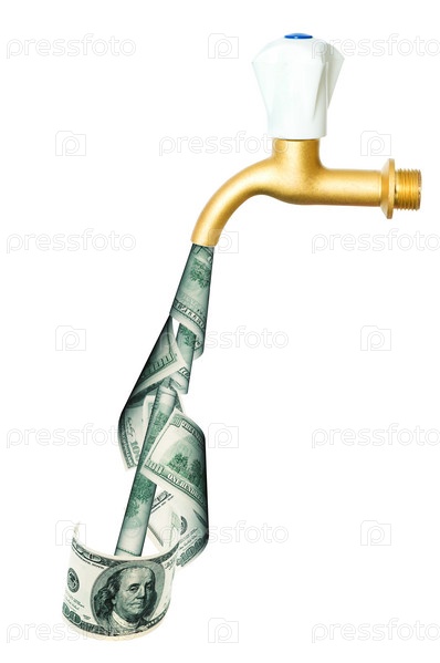 Водопроводный кран с долларами на белом фоне