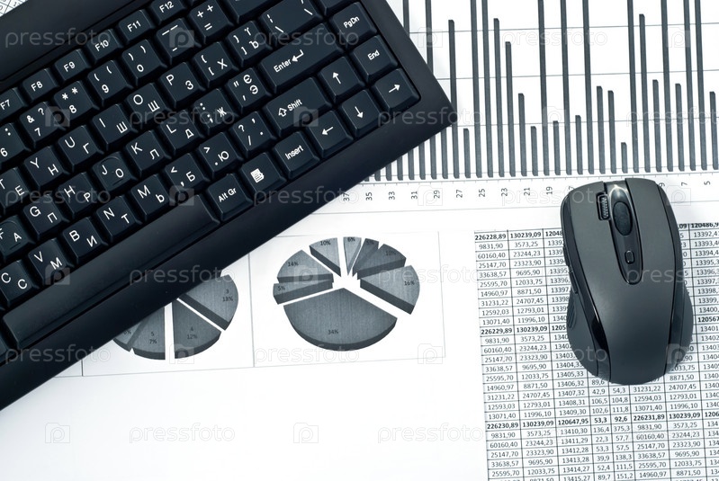 Черная клавиатура и мышь, лежащие на биржевой диаграмме