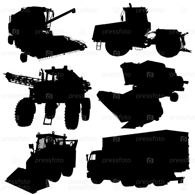 Набор силуэтов сельскохозяйственных транспортных средств. Векторные иллюстрации