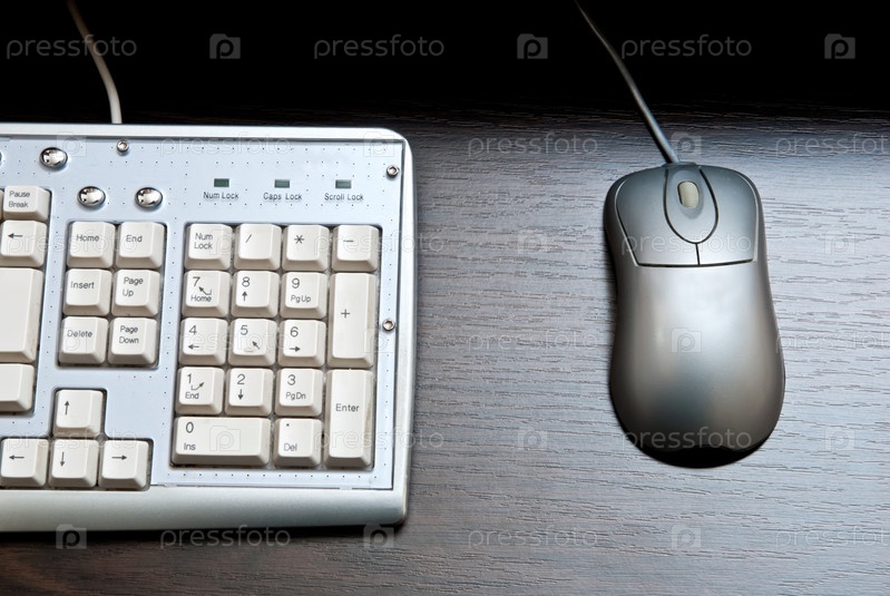 Белая клавиатура и мышь, лежащие на деревянном столе