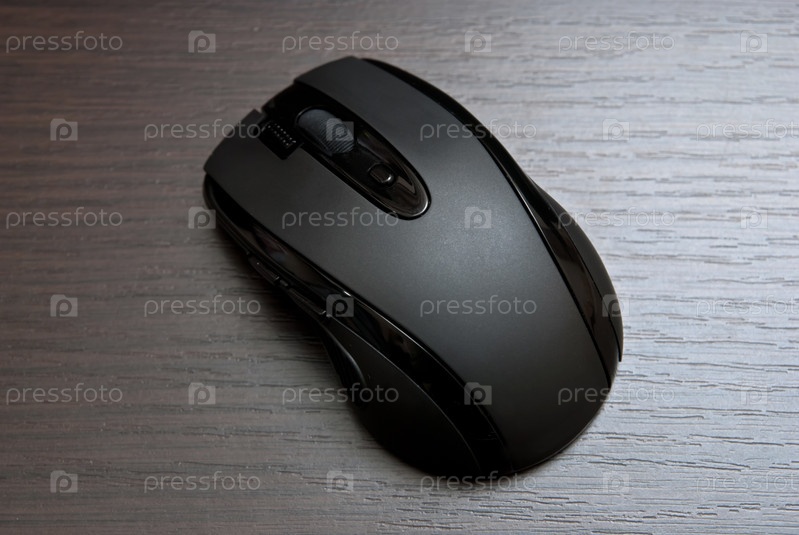 Черная беспроводная мышь, лежащая на деревянном столе