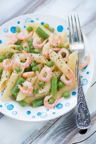 Пенне с креветками, горохом и фасолью