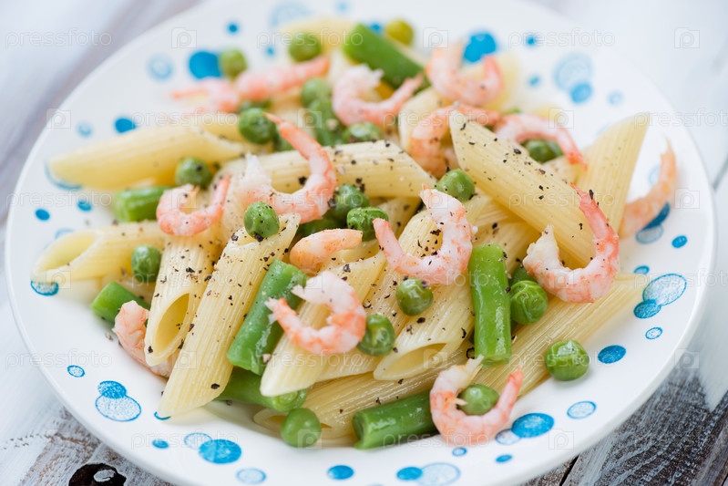 Пенне с креветками и овощами крупным планом