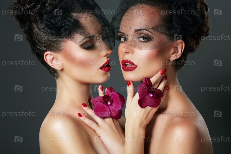 Две сексуальные женщины с фиолетовыми орхидеями