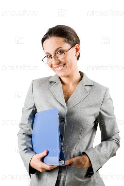 Портрет элегантной деловой женщины с папкой в руке, смотрящей на камеру и улыбающейся