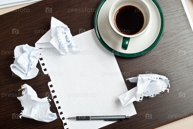 Чашка кофе, ручка и скомканные листы бумаги на деревянном столе