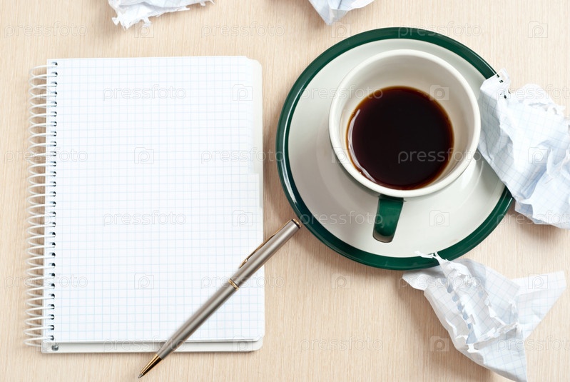 Чашка кофе, целый лист и скомканные бумажки на деревянном столе