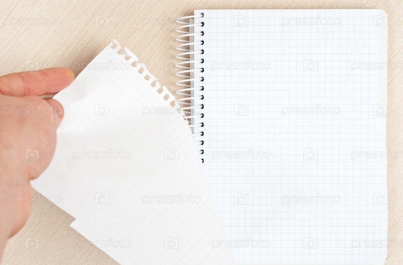 Рука, вырывающая страницу из блокнота на деревянном столе